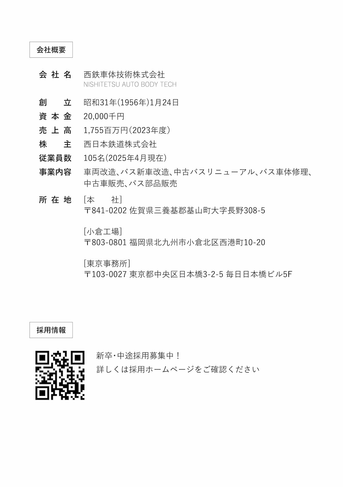 この度、西鉄車体技術のYouTubeチャンネルを開設いたしました。 初回公開の動画では、弊社で製作に携わった「パジェロバスEV」についての紹介をしております。(全4話) 今後も写真や文章だけでは伝えきれない情報を順次配信 […]
